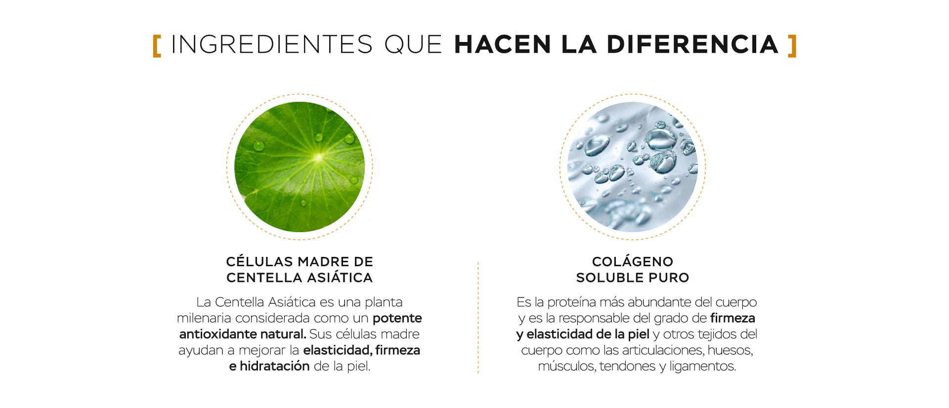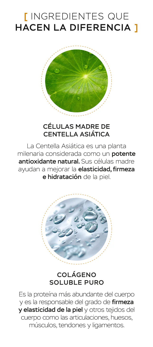 - Las células madre de centella asiática promueven la hidratación, firmeza y elasticidad.