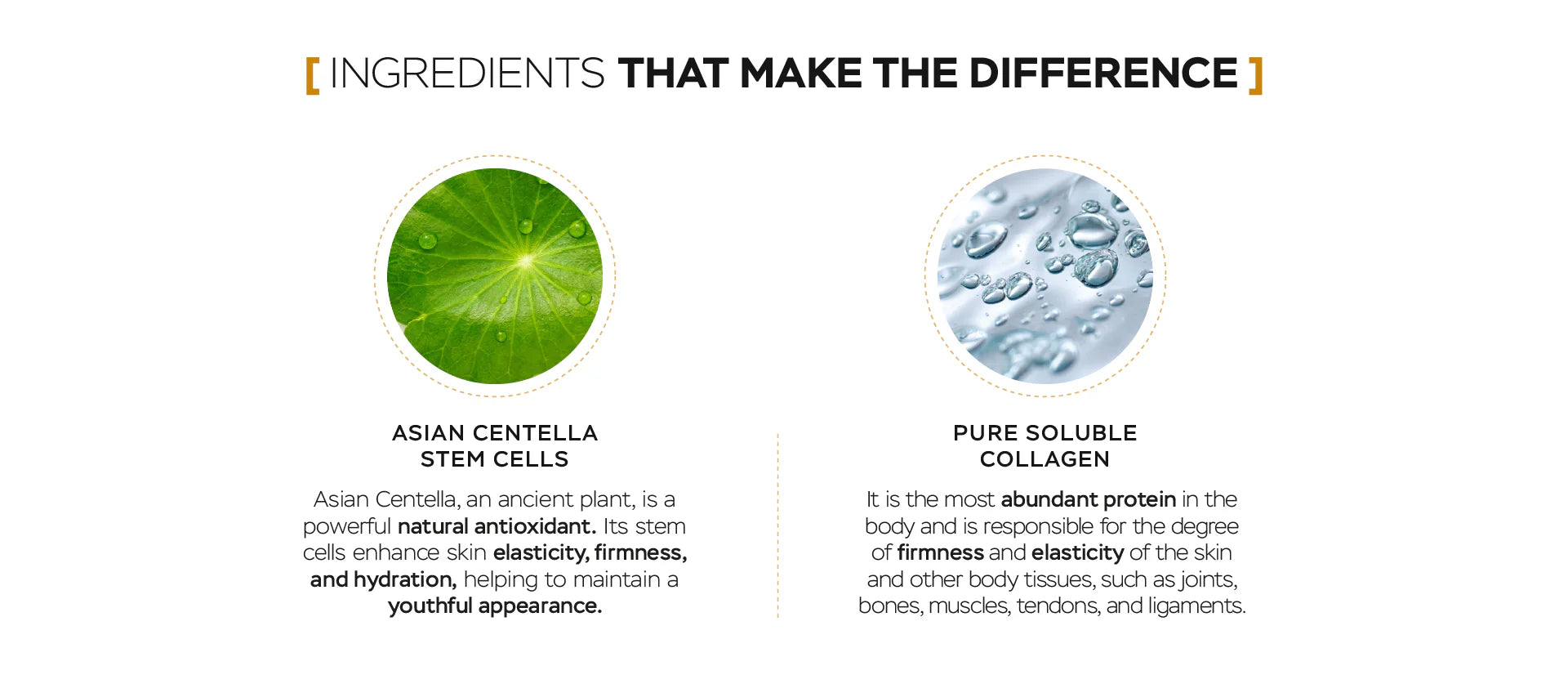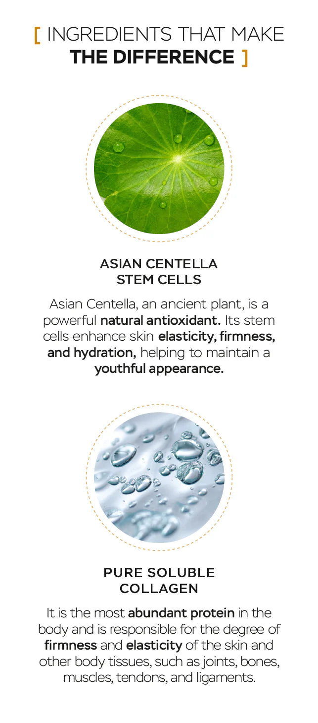 - Stem cells from centella asiatica promote hydration, firmness, and elasticity.